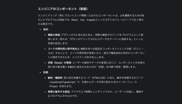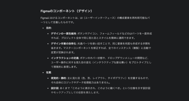 また、ざっくりでも違いを把握するために、 Figma と実装のコンポーネントの違いは何か、AIに聞いてみました。