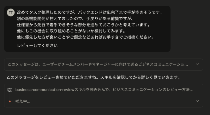 そこで作ったのが、AI チャットツール Claude Desktop で使用する business-communication-review スキルです。