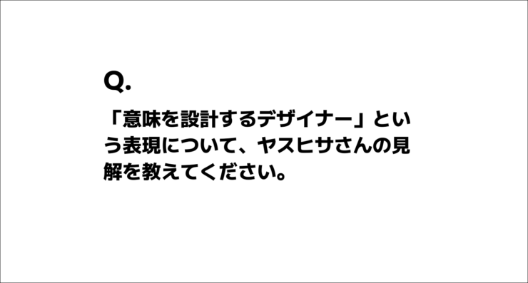 昨今、AI の台頭によって「ビジュアルを作るだけがデザイナーの仕事ではない」という論調が強まっています。その中で目にするようになったのが、「意味を設計する」という表現です。座談会では、この言葉について、ヤスヒサさんの見解を伺う質問も飛び出しました。